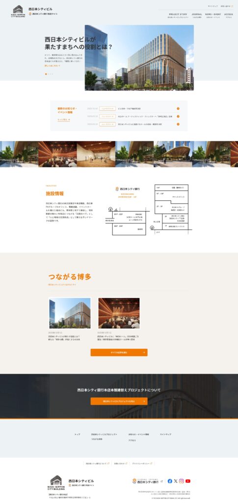 WEBサイトでは、西日本シティ銀行の想いと地域との交流について触れる「つながる博多」や、施設概要や開発への想いに触れる「西日本シティビルプロジェクト」など、視覚的にも伝わりやすく、洗練されたデザインとなっています。