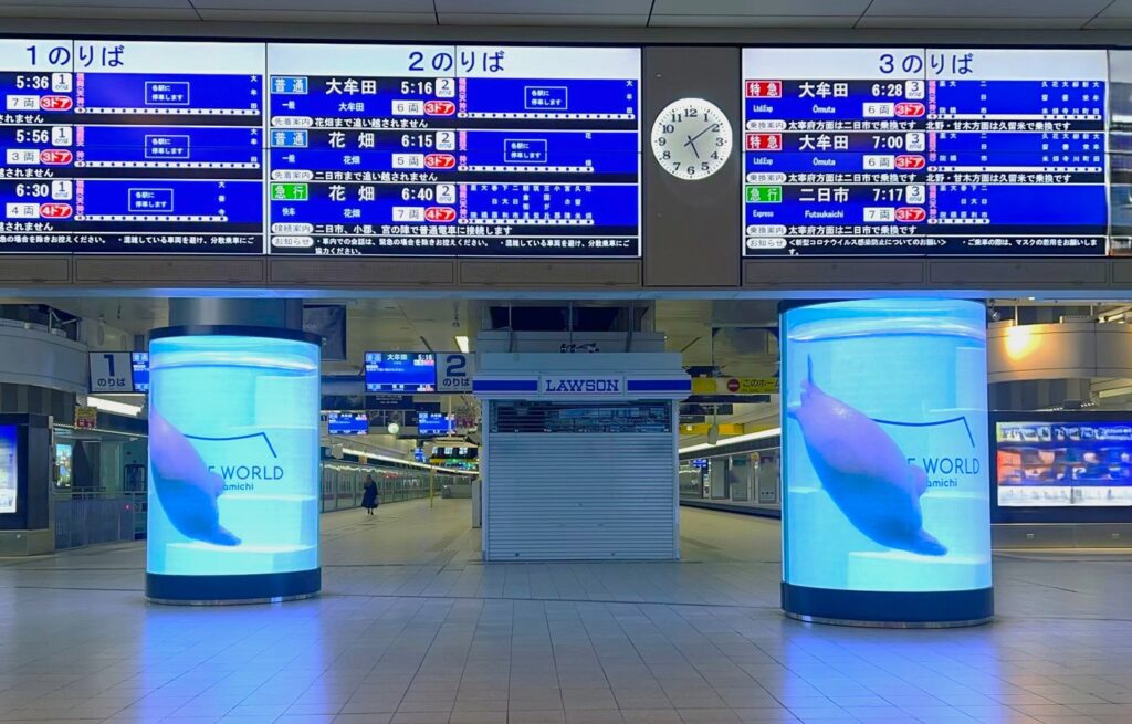 西鉄福岡(天神)駅の「Tenjin Tree Vision」は、西日本初となる駅構内の円柱状デジタルサイネージです。